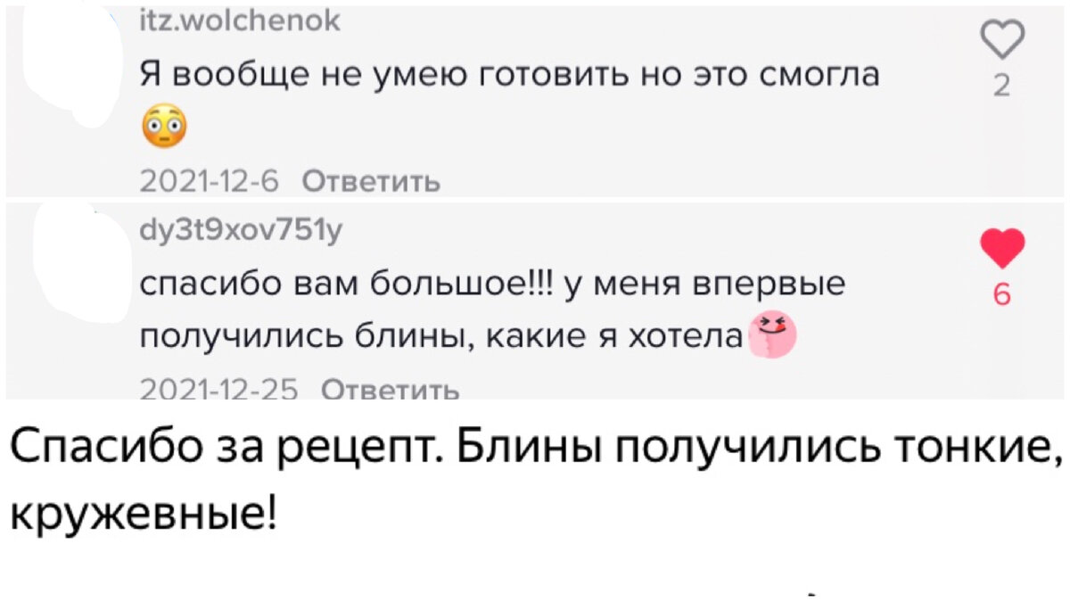 Некоторые пользователи делятся своими опытом. Одна из подписчиц долго искала идеальный рецепт, пробовала разные сковородки и сочетания ингредиентов. Однако у нее возникли трудности с мукой: те блины, что она приготовила, оказались толстыми, как будто в них добавили соду. Позже выяснилось, что использовалась мука для выпечки с разрыхлителем. Когда подписчица вернулась к обычной пшеничной муке, блинчики получились отличными.